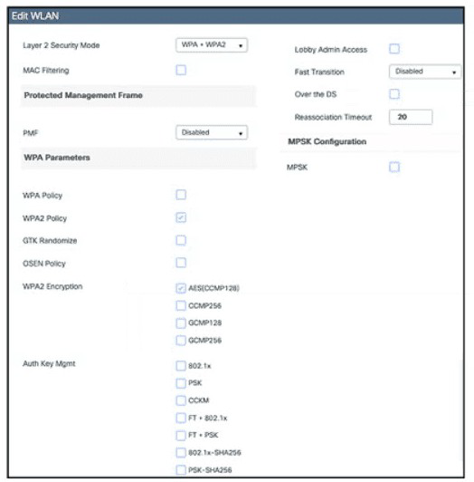 Which action must be taken to configure a WLAN for WPA2-AES with PSK and allow only