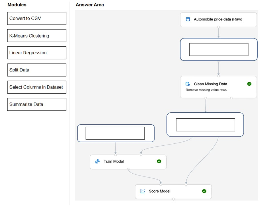 Which type of modules should you use to complete the model? To answer, drag the appropriate modules to the correct locations. Each module may be used once, more than once, or not at all. You may need to drag the split bar between panes or scroll to view content.