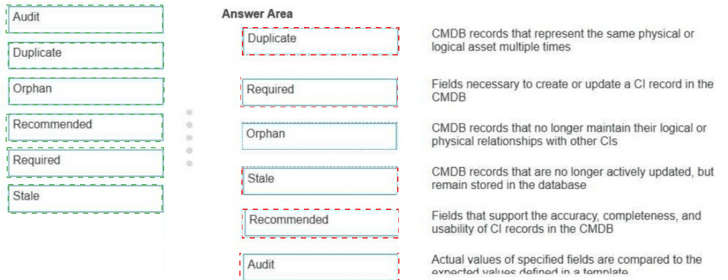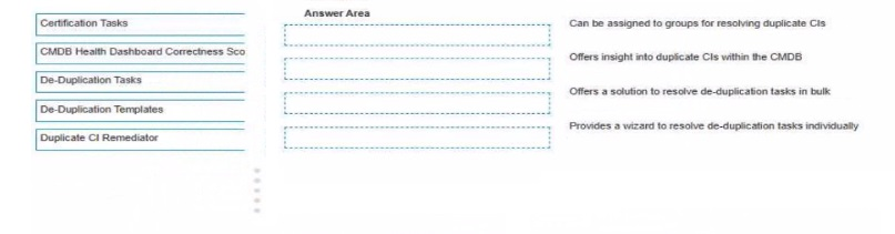 ACMDB Administrator seeks to understand the available tools for preventing addressing, and remediating duplicate CIs Drag and drop each feature with the corresponding outcome Some options may not apply.