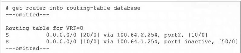 Currently, the port2 route has distance 20, which is higher (worse) than the port1 route's distance 10. However, the port1 route is inactive, meaning it is not eligible for the FIB, so port2 is installed as the active default route.
