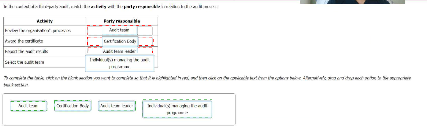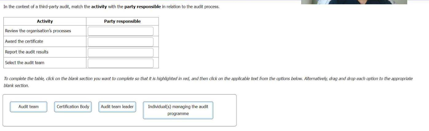 In the context of a third-party audit, match the activity with the party responsible in relation