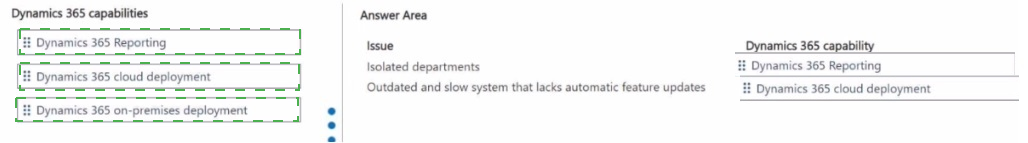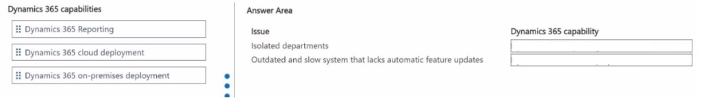 Which Dynamics 365 capability should you use? To answer, drag the appropriate Dynamics 365 capability to the correct issue. Each Dynamics 365 capability may be used once, more than once, or not at all. You may need to drag the split bar between panes or scroll to view content.