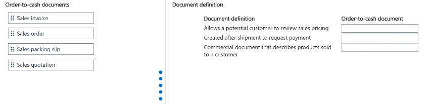 Match each order-to-cash document to its definition. To answer, move the appropriate order-to-cash document from the column on the left to its definition on the right.