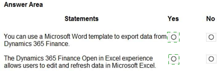 This question tests knowledge of two specific data interaction and reporting features in Dynamics 365 Finance: the use of Microsoft Word for document generation and the functionality of the "Open in Excel" feature.