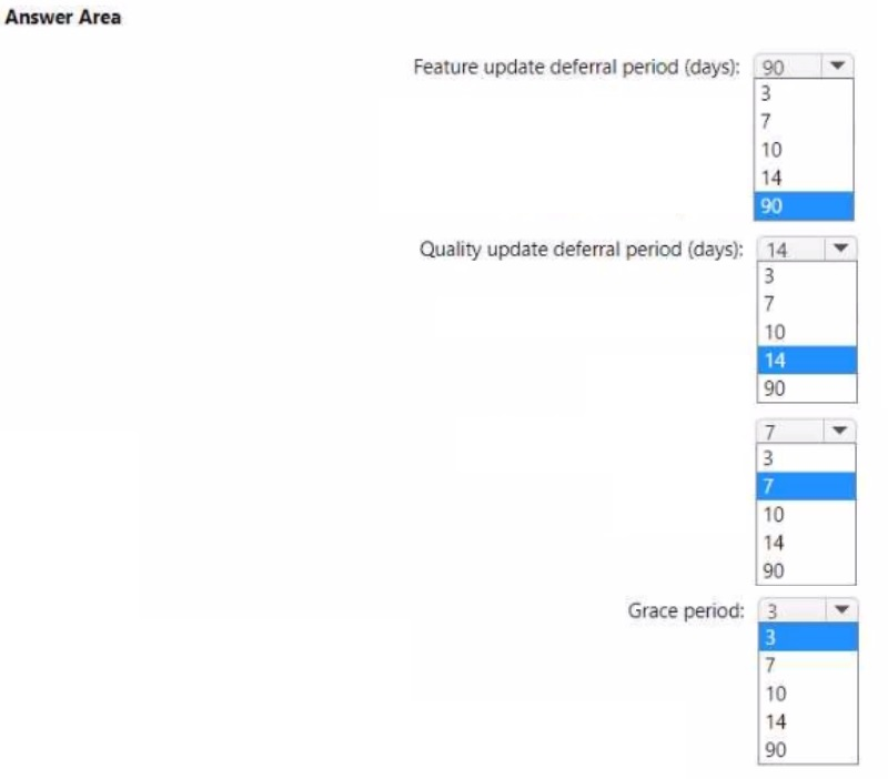 How should you configure the update ring? To answer, select the appropriate options in the answer area. NOTE: Each correct selection is worth one point.