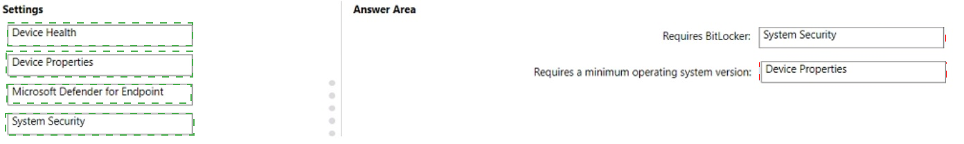 Which setting of the compliance policy should you configure for each requirement? To answer, drag the appropriate settings to the correct requirements. Each setting may be used once, more than once, or not at all. You may need to drag the split bar between panes or scroll to view content.