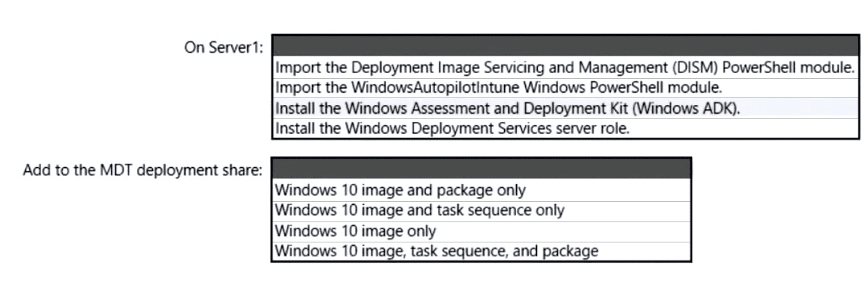 What should you do on Server1, and what are the minimum components you should add to the MDT deployment share? To answer, select the appropriate options in the answer area.
