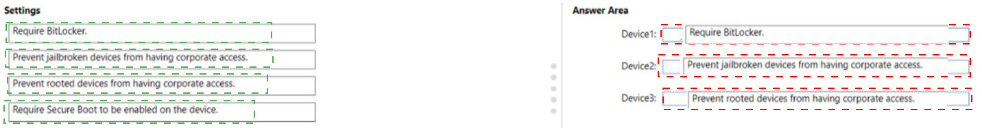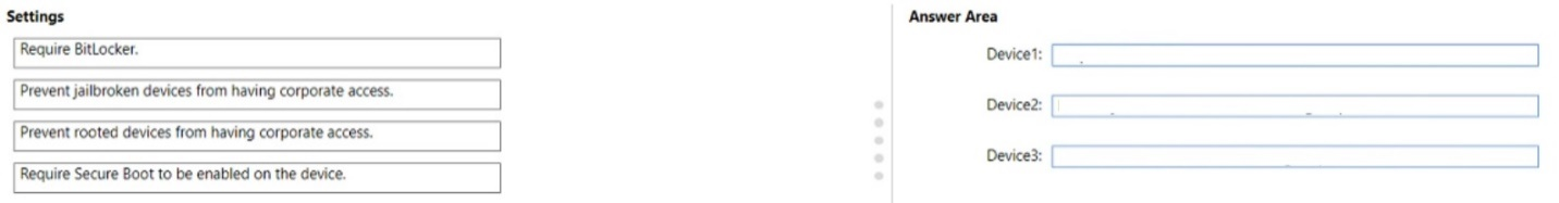 Which compliance policy setting should you configure for each device? To answer, drag the appropriate settings to the correct devices. Each setting may be used once, more than once, or not at all. You may need to drag the split bar between panes or scroll to view content.