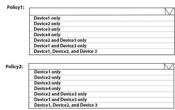 To which devices do Policy1 and Policy2 apply? To answer, select the appropriate options in the answer area.