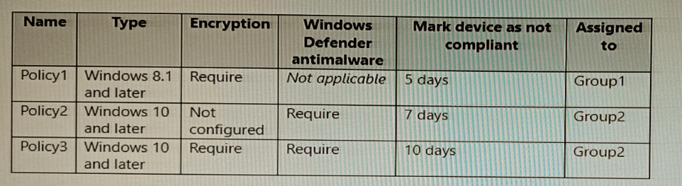 Intune has the device compliance policies shown in the following table.