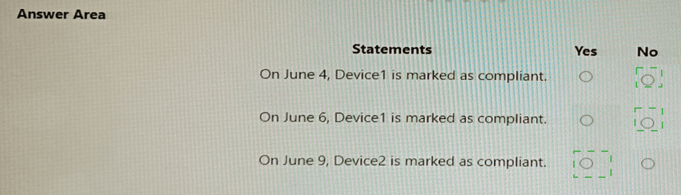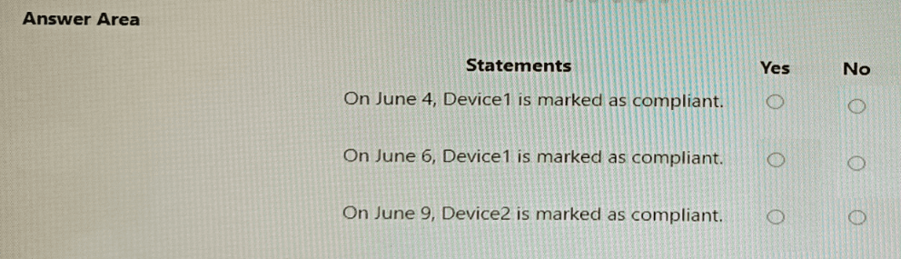 On June 1, you enroll Windows 10 devices in Intune as shown in the following table.