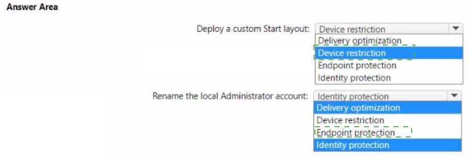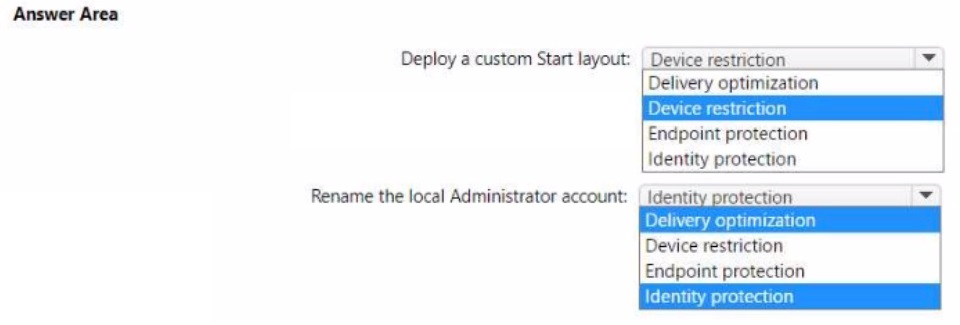 You have a Microsoft 365 subscription that uses Microsoft Intune and contains 100 Windows 10 devices. You need to create Intune configuration profiles to perform the following actions on the devices: