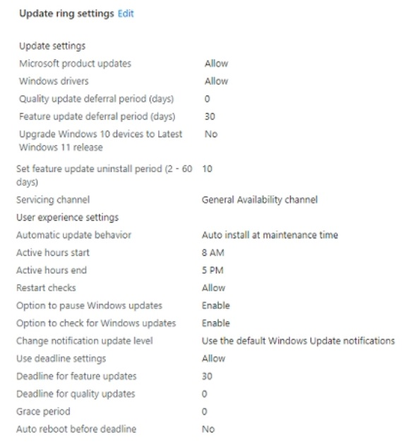 You create a new update rings policy named Policy1 as shown in the following exhibit.