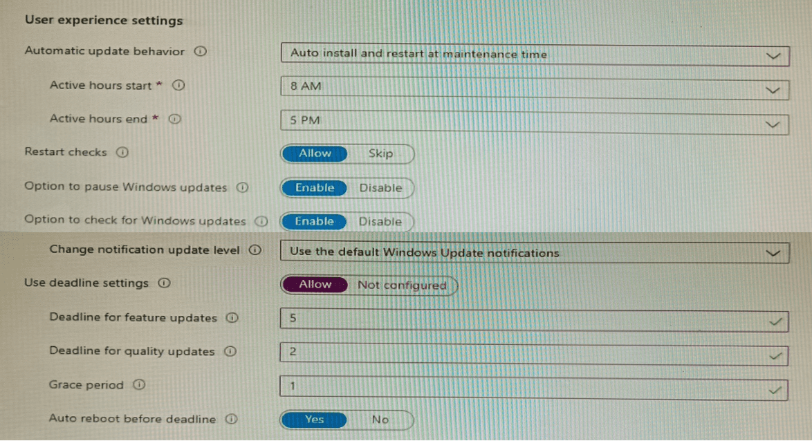 You create an update ring for Windows 10 and later and configure the User experience settings for the ring as shown in the following exhibit.
