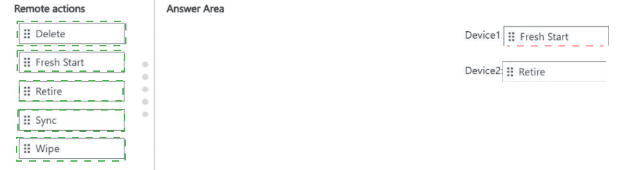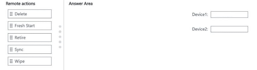 Which remote action should you use on each device? To answer, drag the appropriate remote actions to the correct devices. Each remote action may be used once, more than once, or not at all. You may need to drag the split bar between panes or scroll to view content.