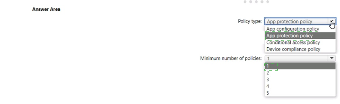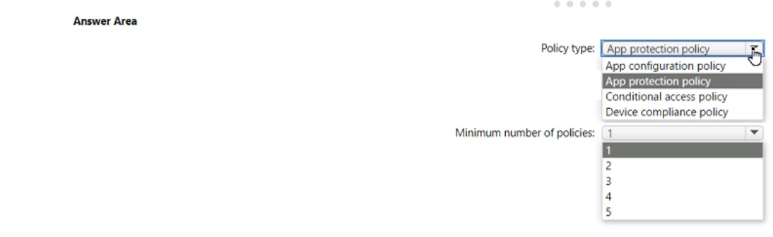 Which type of policy and how many policies should you create in Intune? To answer, select the appropriate options in the answer area.
