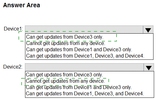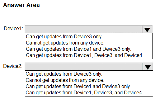 From which devices can Device1 and Device2 get updates? To answer, select the