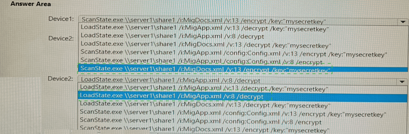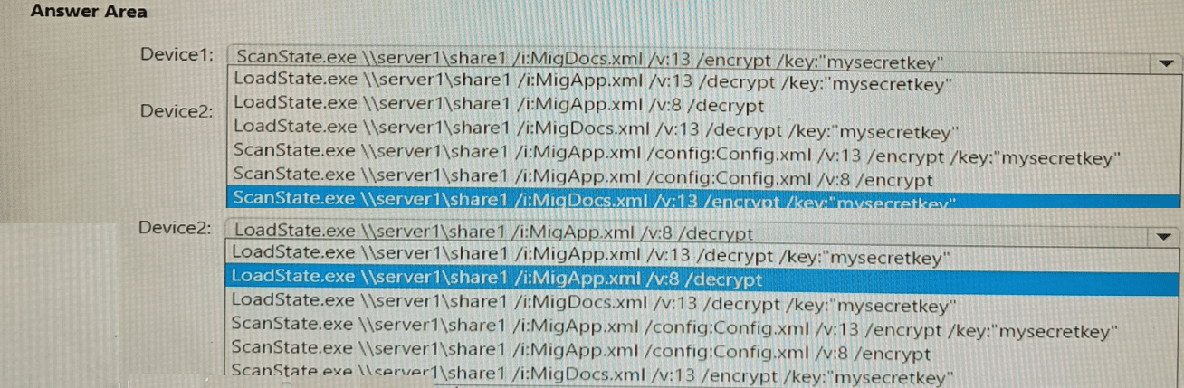 Which command should you run on each device? To answer, select the appropriate options in the answer area.