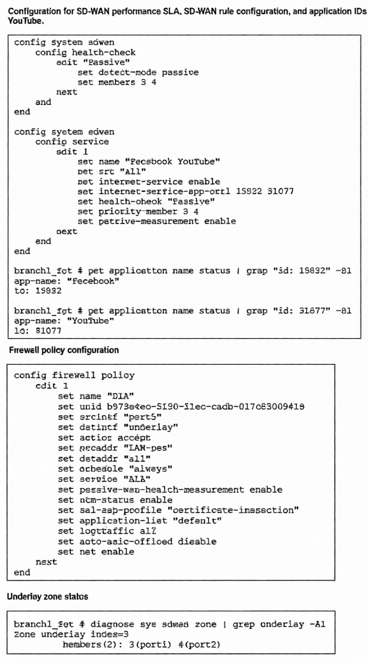 The exhibits show the configuration for SD-WAN performance. SD-WAN rule, the application IDs of