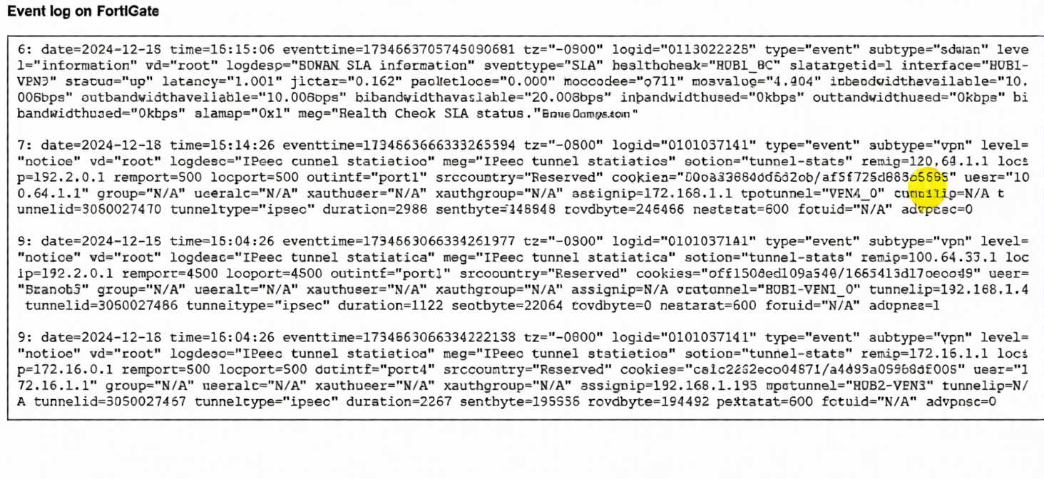The event log on a FortiGate device is shown.