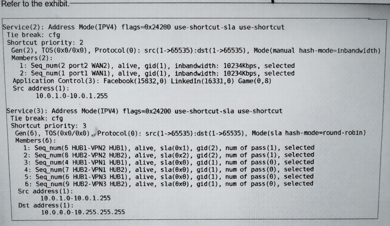 A: HUB2-VPN2 alone is incorrect because the rule uses round-robin load balancing between both SLA-compliant members. Traffic could use either tunnel.