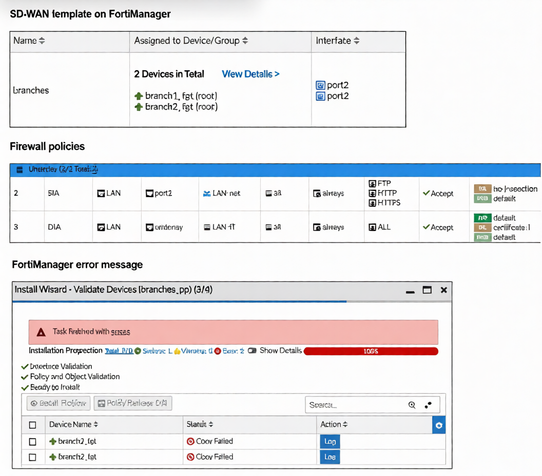devices, FortiManager reports an error as shown in the third exhibit.