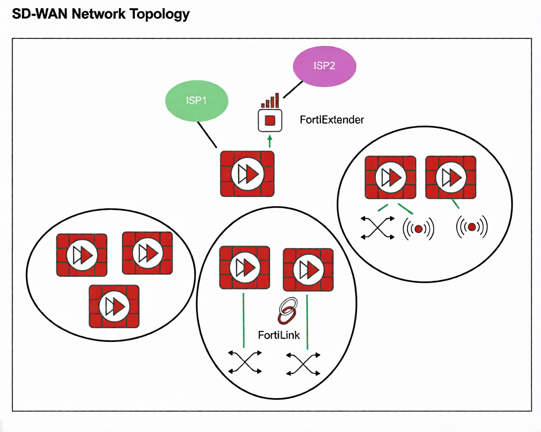 The network contains many FortiGate devices. Some are used as NGFW, and some are installed with