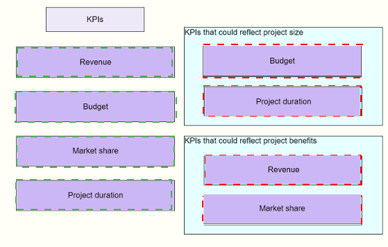 For an ongoing project, match the key performance indicators (KPIs) on the left to the correct categories on the right.