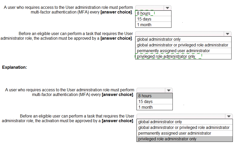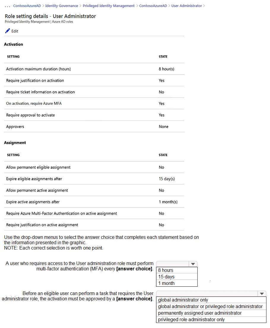 You have an Azure Active Directory (Azure AD) tenant that contains Azure AD Privileged Identity Management (PIM) role settings for the User administrator role as shown in the following exhibit.