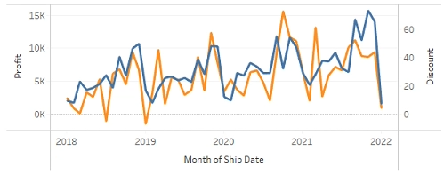 You have the following chart that shows profits and discounts over time.
