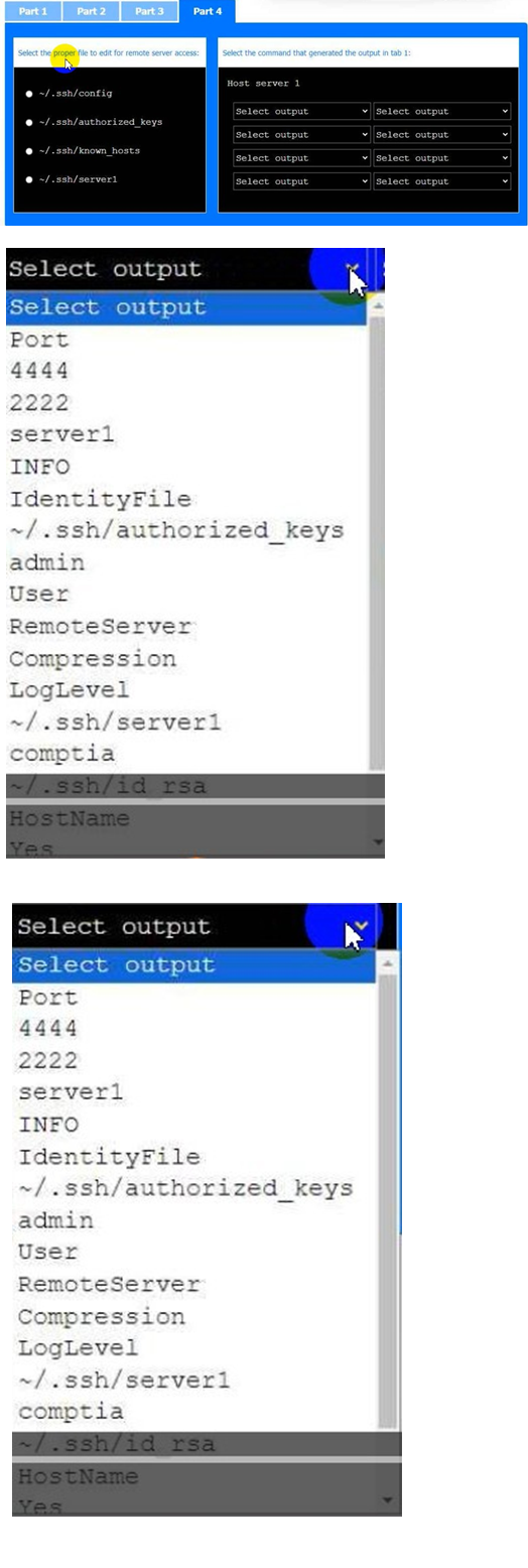 In part 4, it asks you to select the proper file for editing to enable remote server access. Based on standard SSH configuration requirements, the proper file to edit for remote server access would be ~/.ssh/config.